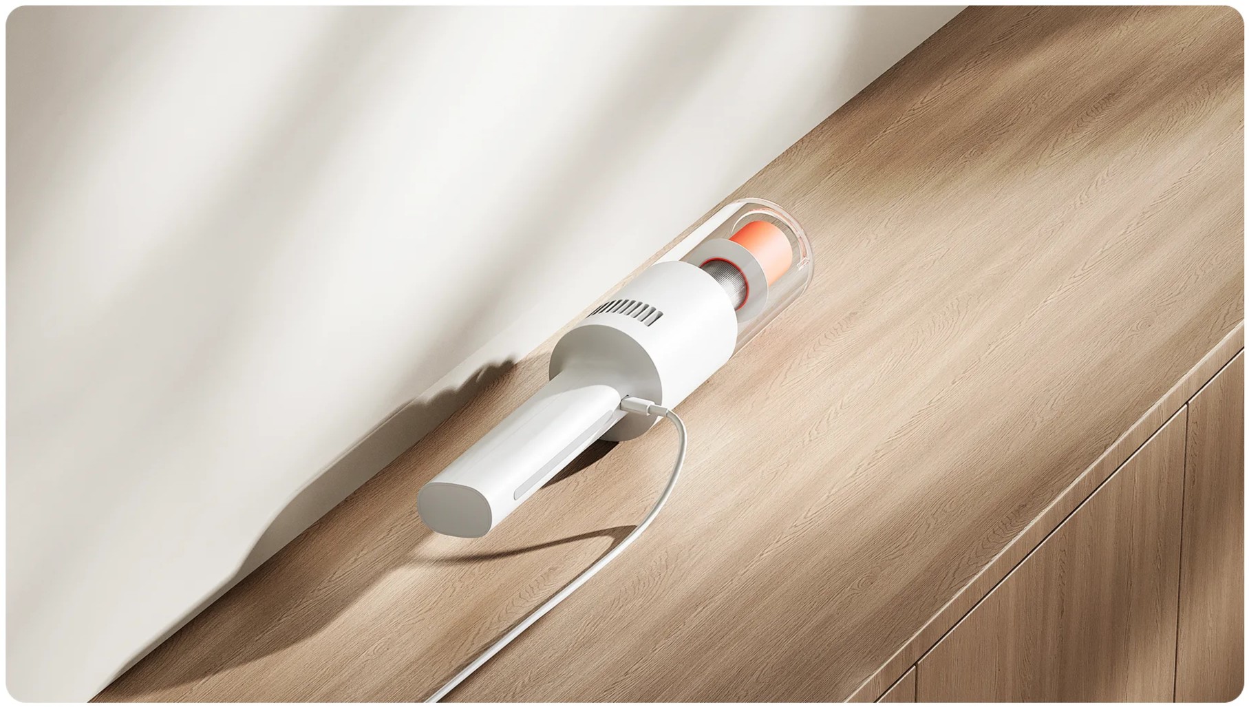 Вертикальный беспроводной пылесос Xiaomi Vacuum Cleaner P30 выполнен в компактном корпусе белого цвета с оранжевыми акцентами. Конструкция цельная, без разборной трубы, что делает устройство более устойчивым и удобным для быстрой уборки. Вес пылесоса составляет 1,46 кг, поэтому им комфортно пользоваться одной рукой и легко переносить между комнатами.