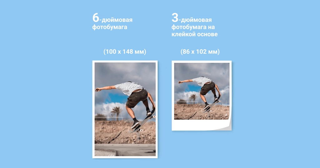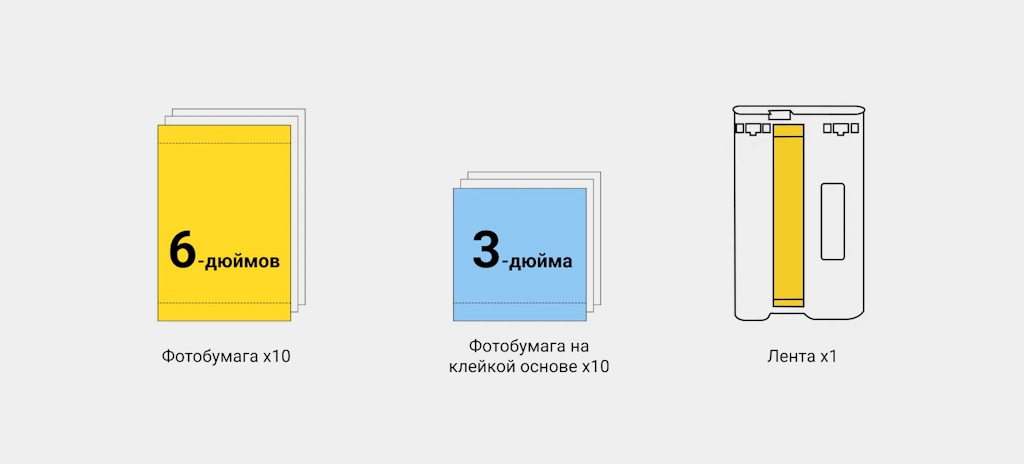 В комплект уже входит всё необходимое: 10 листов 6-дюймовой фотобумаги, 10 листов 3-дюймовой фотобумаги на клейкой основе и 1 лента.