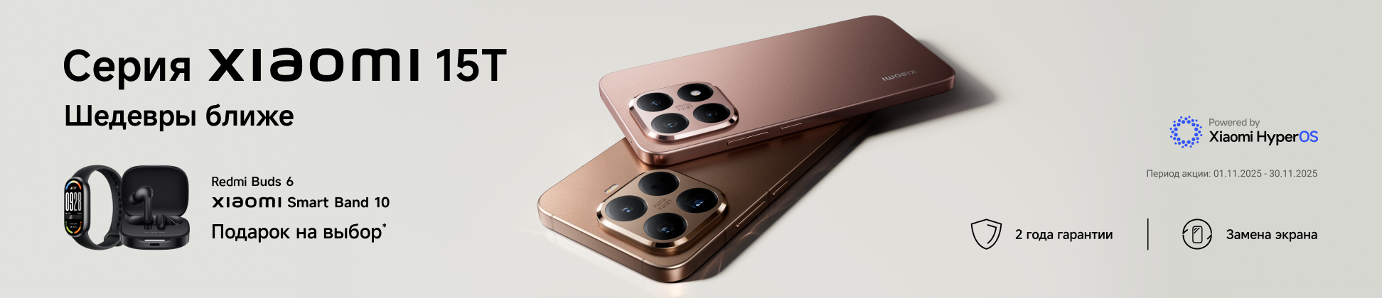 При покупке Xiaomi 15T/15T Pro — наушники REDMI Buds 6 или один из фитнес-браслетов Xiaomi Smart Band 10 (розовый, черный, серебристый) в подарок на выбор!